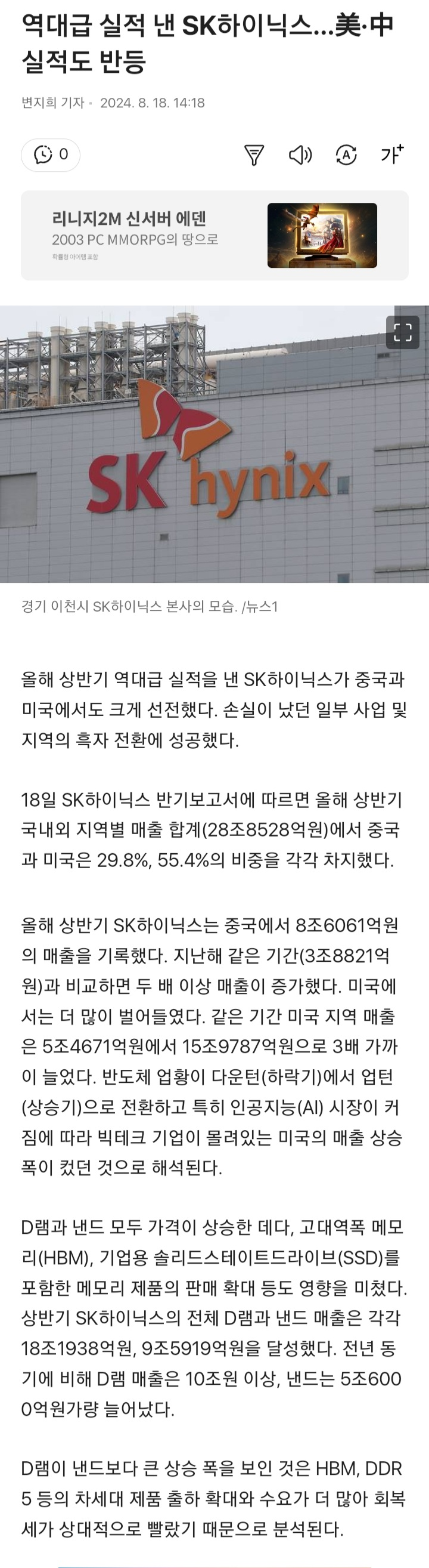 중국 스마트폰들은 이미 세계 최고 속도를 자랑하는 SK하이닉스의 'LPDDR5T' 메모리를 탑재하고 있어요. 하지만 미국의 제재를 우려한 중국은 더욱더 삼성과 SK의 반도체를 대량으로 구매해 놓으려고 안간힘을 쓰고 있습니다. 그럼에도 불구하고 SK하이닉스의 매출 비중을 보면 미국이 55.4%로 절대적이고, 중국은 29.8%에 불과하죠.