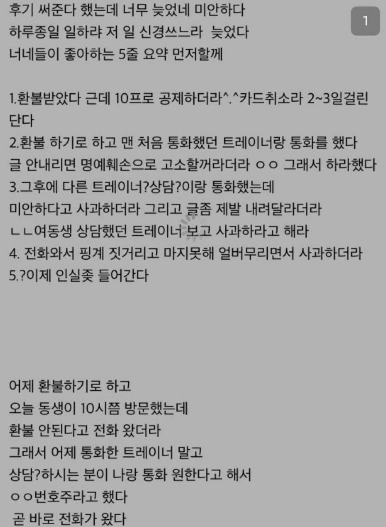 글쓴이가 결국 환불 후 후기글을 남겼습니다.