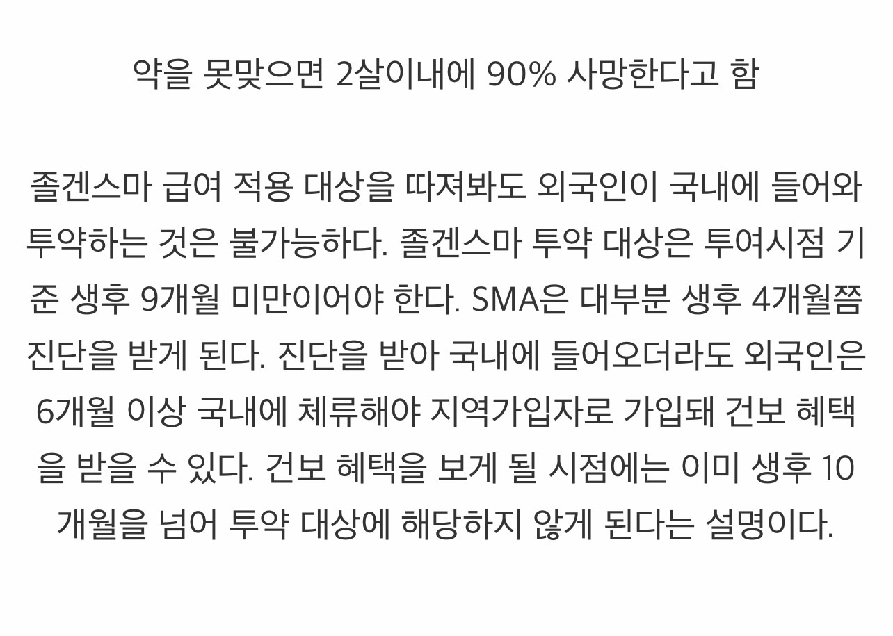 투여시점은 생후 9개월 미만만 가능한데 이 병은 4개월쯤 진단이 가능하고 진단을 받고 국내에 들어오더라도 외국인은 6개월 이상 국내에 체류해야 지역가입자로 건강보험 혜택이 시작되는데 이러면 이미 생후 10개월이 넘어 투약 대상이 안되기에 외국인들이 불필요하게 국내에 들어와 20억짜리 약을 투여받는일도 없을듯 합니다.