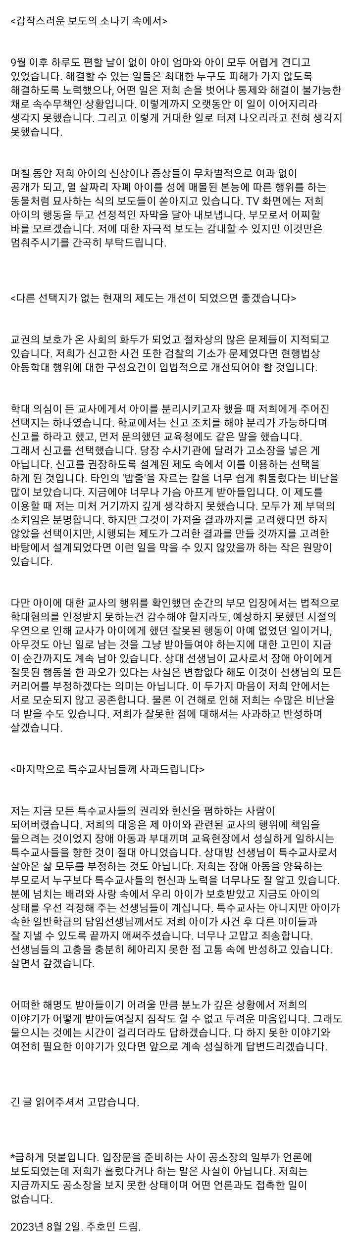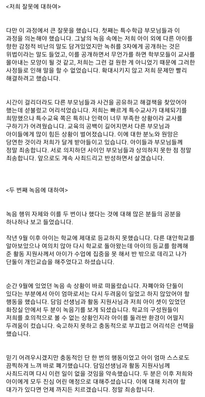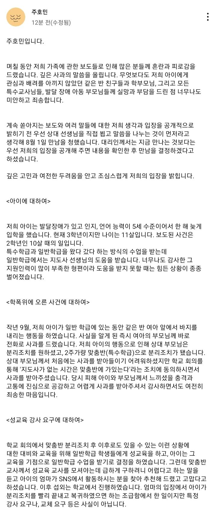 주호민 특수학급 사건에 대한 사과문? 인가???..
