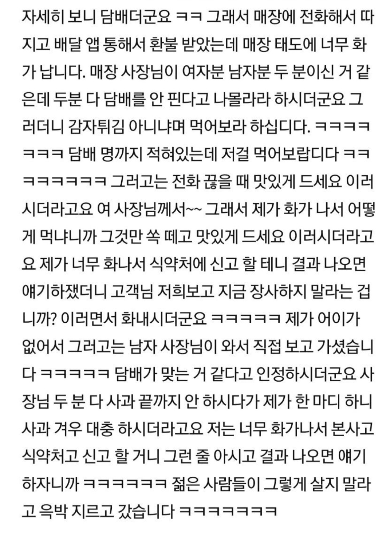 치킨집 사장님은 비흡연자이니깐 억울할수가 있고 배달기사가 했다고 생각할수도 있지만...