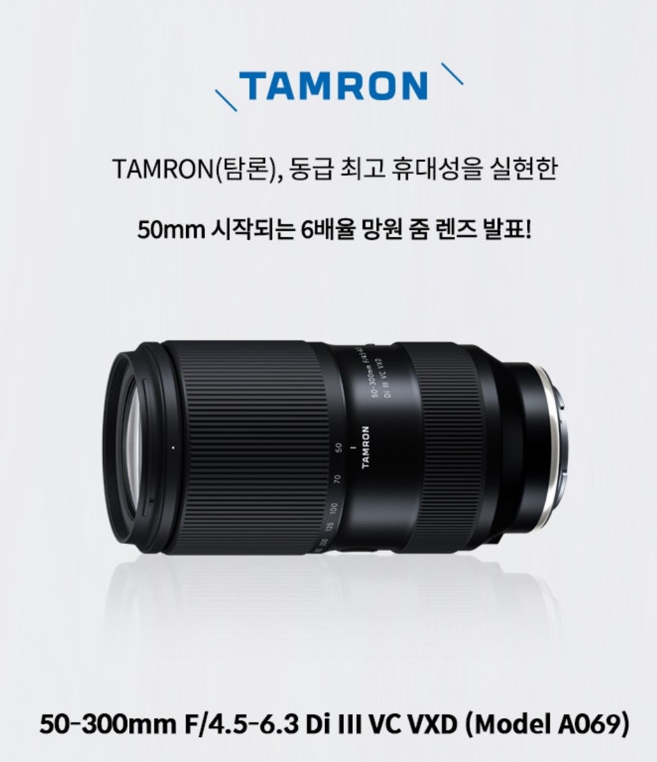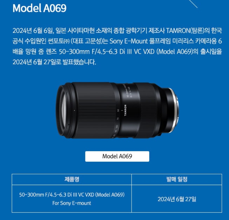 2024년 6월 6일, 일본 사이타마현에 소재한 종합 광학기기 제조사 TAMRON의 한국 공식 수입원인 썬포토(주)는 Sony E-Mount 풀프레임 미러리스 카메라용 6배율 망원 줌 렌즈 50-300mm F/4.5-6.3 Di III VC VXD (Model A069)의 출시일을 2024년 6월 27일로 발표했습니다.
