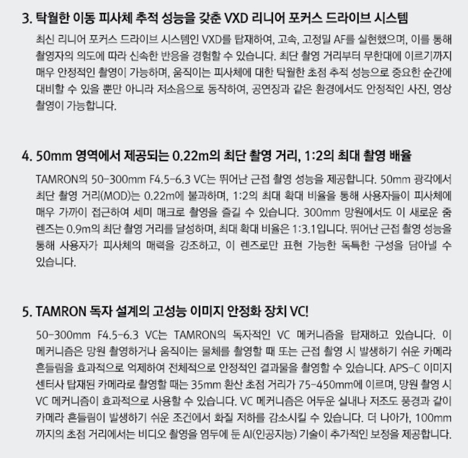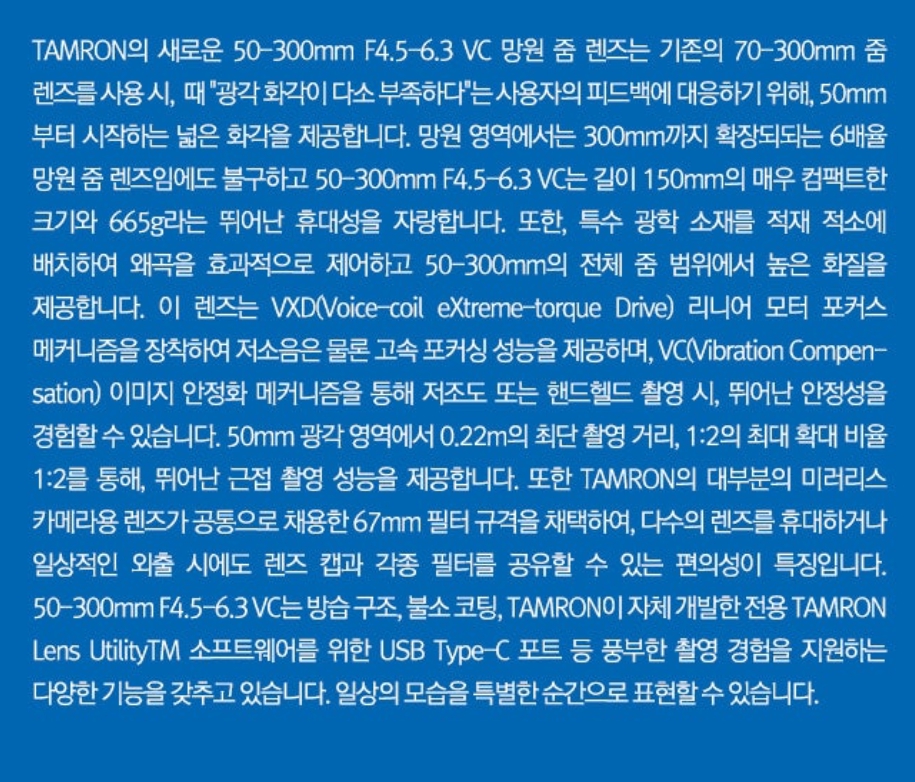 TAMRON의 새로운 50-300mm F/4.5-6.3 Di III VC VXD 렌즈는 동급 최고 수준의 휴대성과 성능을 자랑합니다. 다양한 촬영 상황에서 뛰어난 성능을 발휘하며, 특히 광각 영역에서의 확장된 화각과 고성능 이미지 안정화 장치(VXD, VC)를 통해 어떤 환경에서도 탁월한 결과물을 얻을 수 있습니다. 사진 애호가들에게 강력히 추천드리는 렌즈입니다.