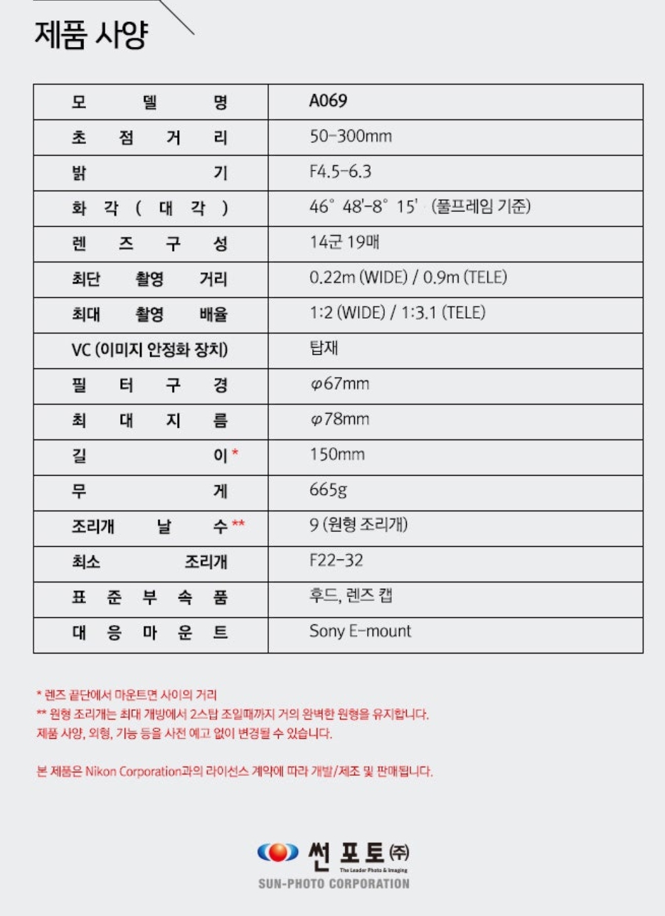 | A069 | 50-300mm | F4.5-6.3 | 46° 48'-8° 15' (풀프레임 기준) | 14군 19매 | 0.22m (WIDE) / 0.9m (TELE) | 1:2 (WIDE) / 1:3.1 (TELE) | 탑재 | Φ67mm | Φ78mm | 150mm | 665g | 9 (원형 조리개) |