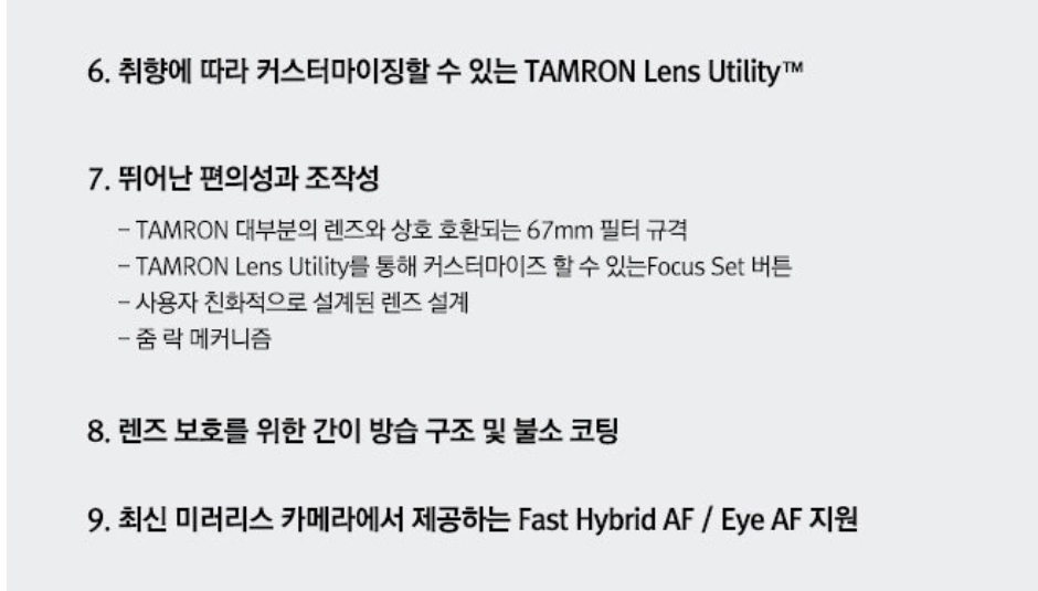 - TAMRON 대부분의 렌즈와 상호 호환되는 67mm 필터 규격