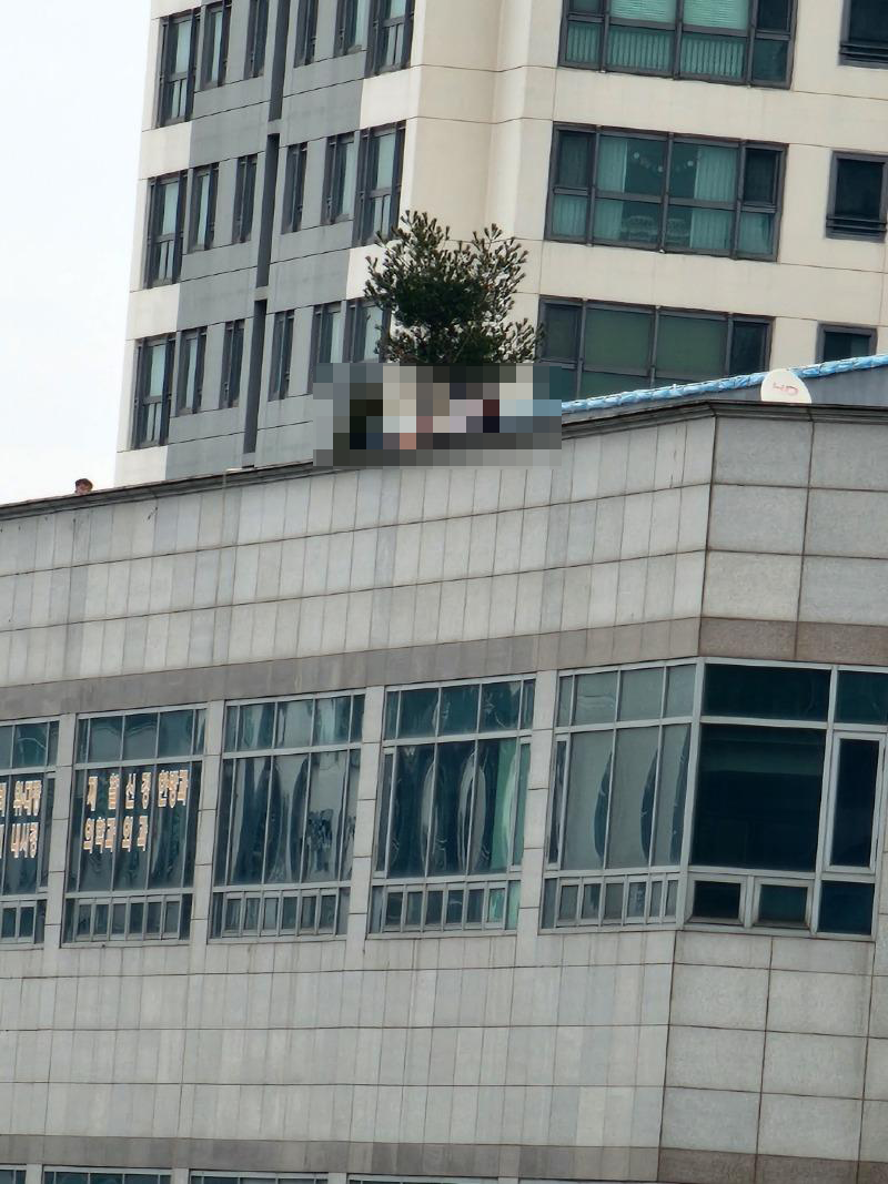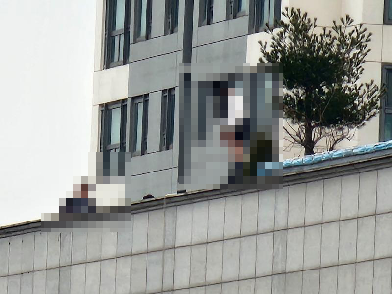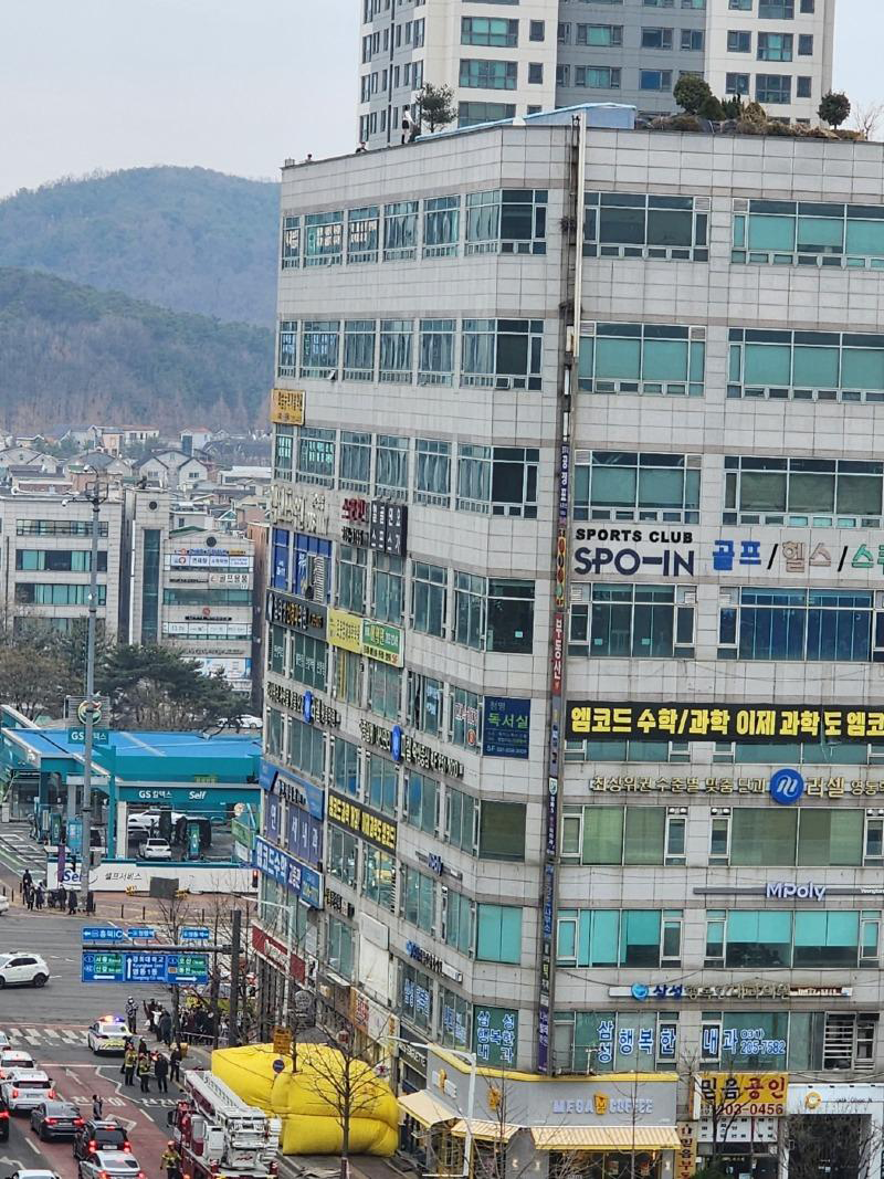 저 난간 위에서 에어쿠션이 없는 쪽으로 걸어서 움직이고 이에 따라 밑에 소방구조대 분들도 쿠션 위치 다시 잡는라 애먹고있습니다.