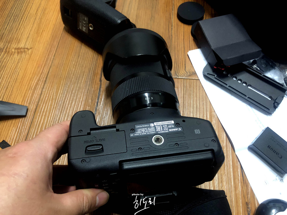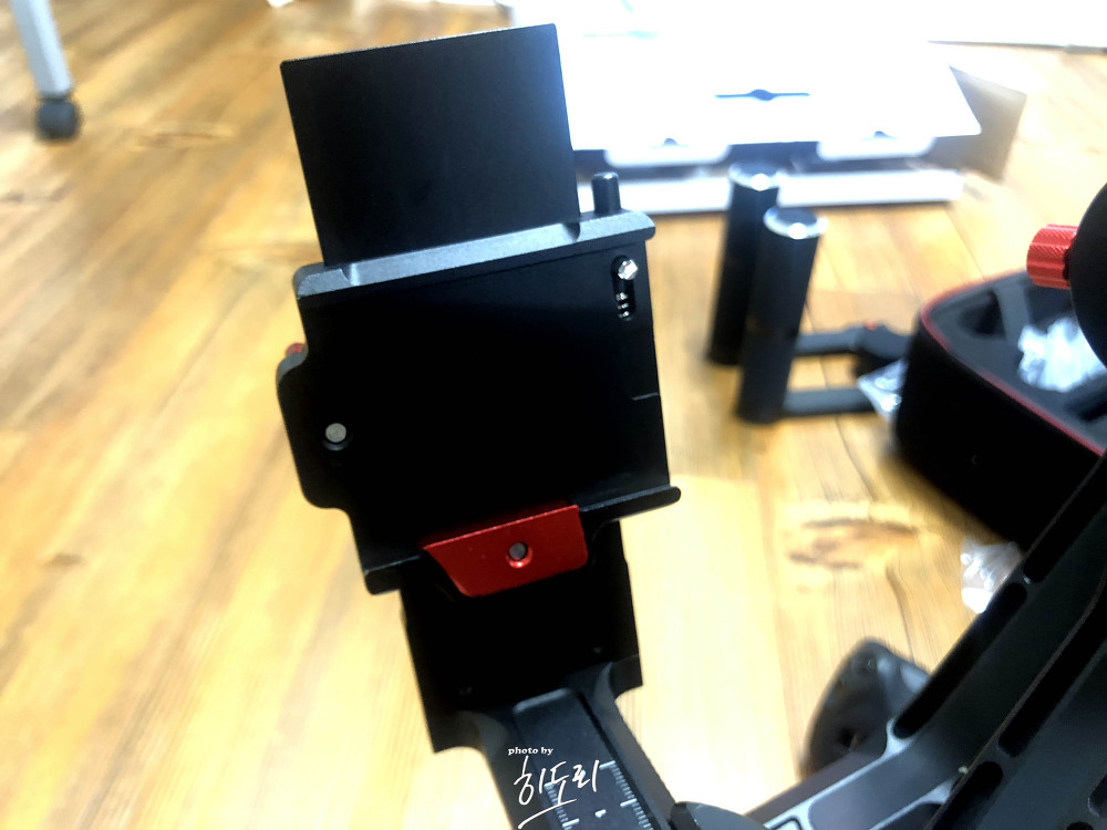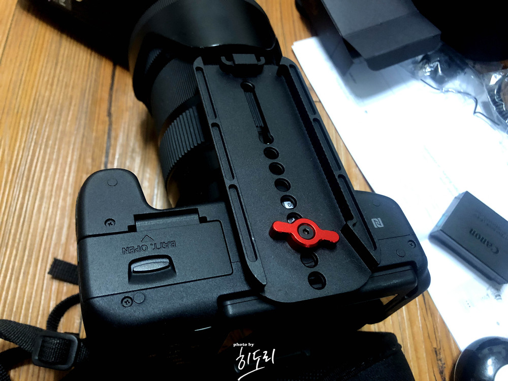 제 세팅(세로그립 + UFO 단렌즈)은 세로그립 때문에 회전부 간섭이 생겨서 아쉽지만 세로그립 분리 후 사용했습니다. 긴 렌즈를 쓰면 플레이트를 최대한 전방으로 당겨 무게중심을 잡는 게 좋아요. 플레이트 분리는 상단 검은 래치(핀) 눌러서 슥 빼면 끝.