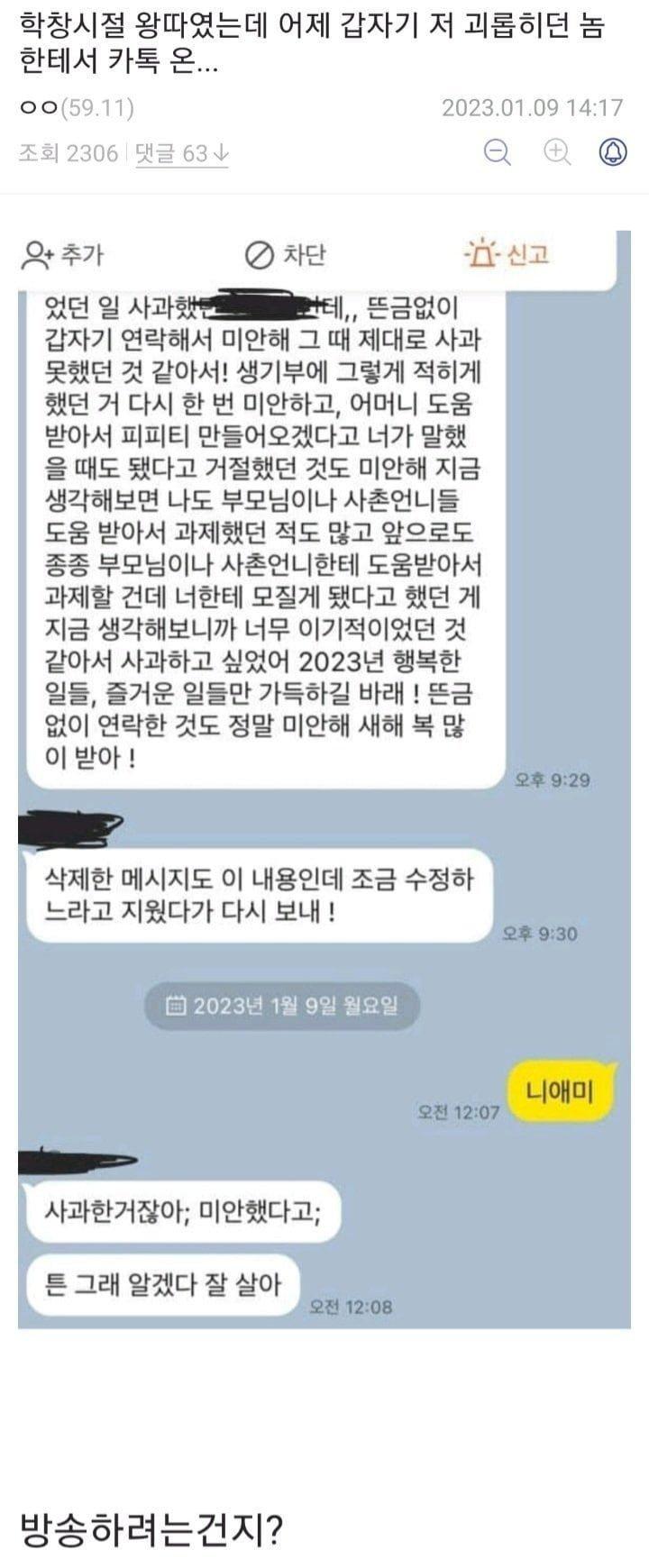 그 중에서도 새해가 시작되고 학창시절 왕따였던 글쓴이에게 카톡이 왔다고 하는데~
