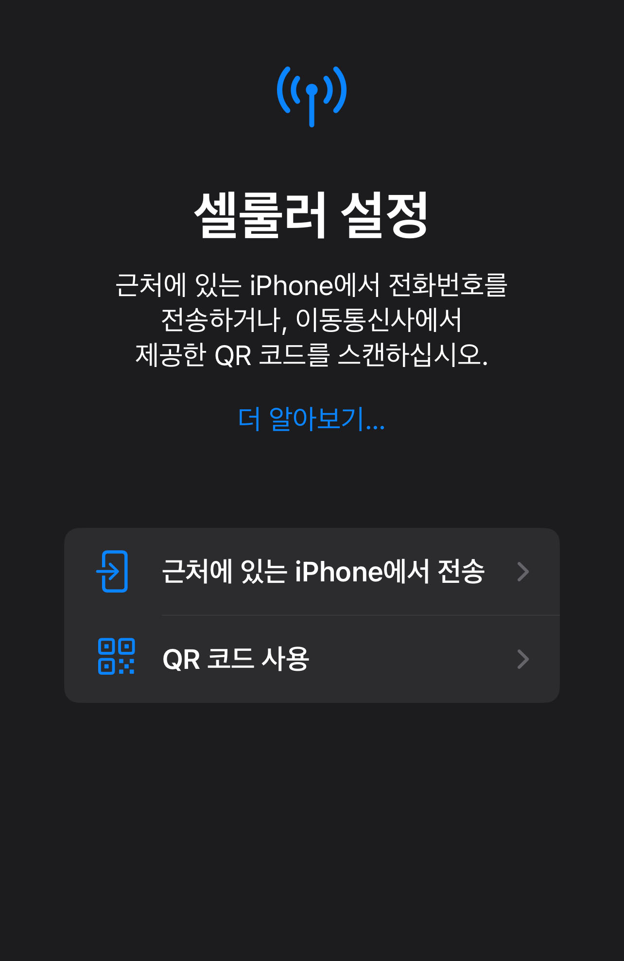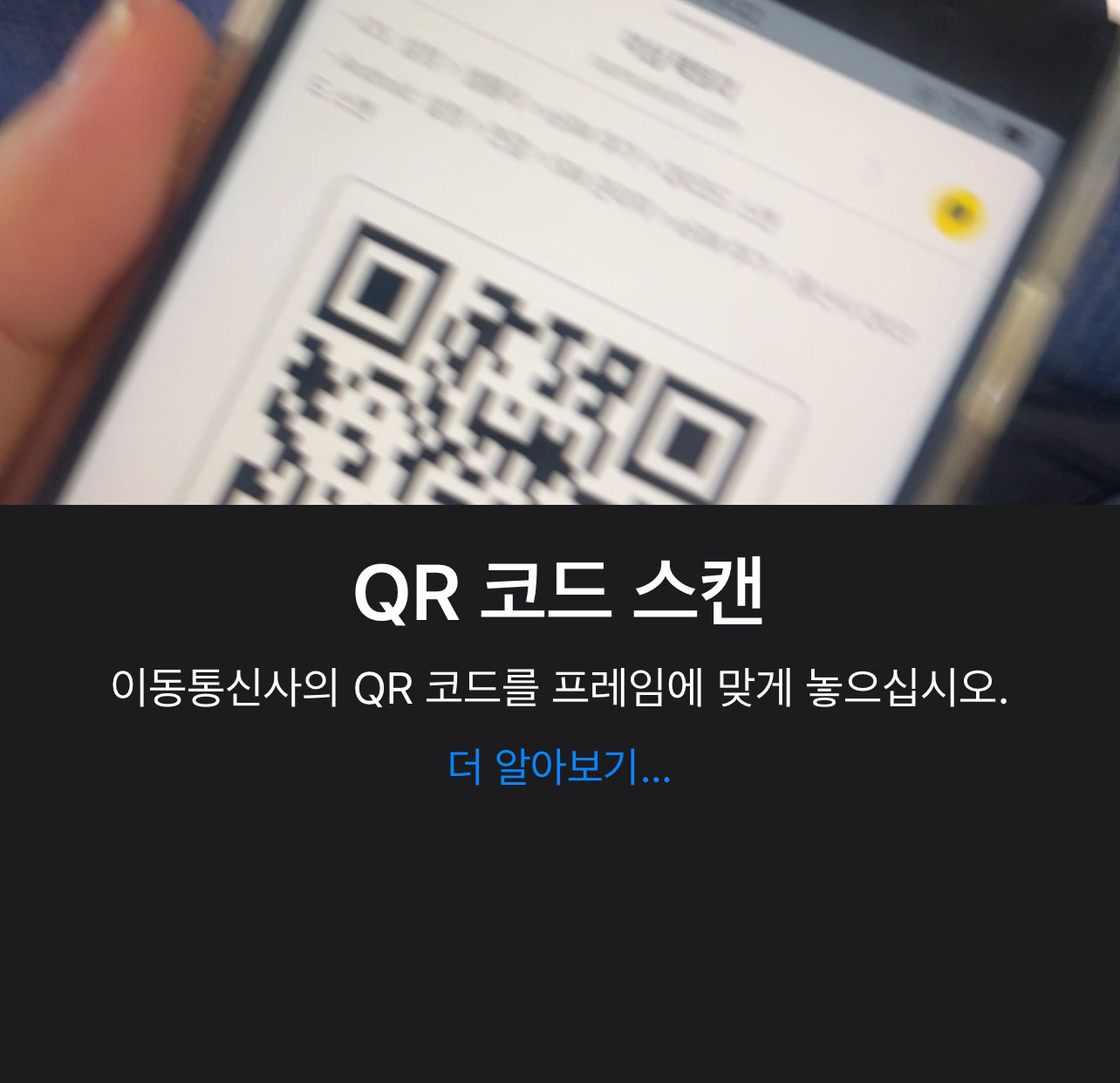 QR 코드 스캔: 받은 QR 코드를 스캔합니다. 카메라 앱을 이용해 QR 코드를 스캔하면 자동으로 eSIM 정보가 입력됩니다.