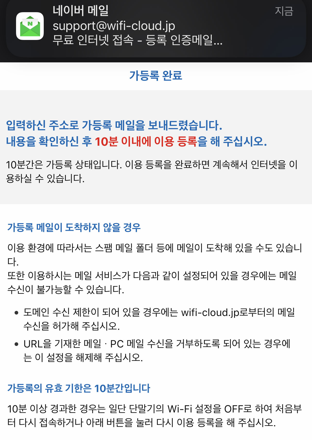 메일 이용등록을 한 뒤 10분정도는 와이파이 이용이 가능하여 메일을 받을수가 있습니다.
