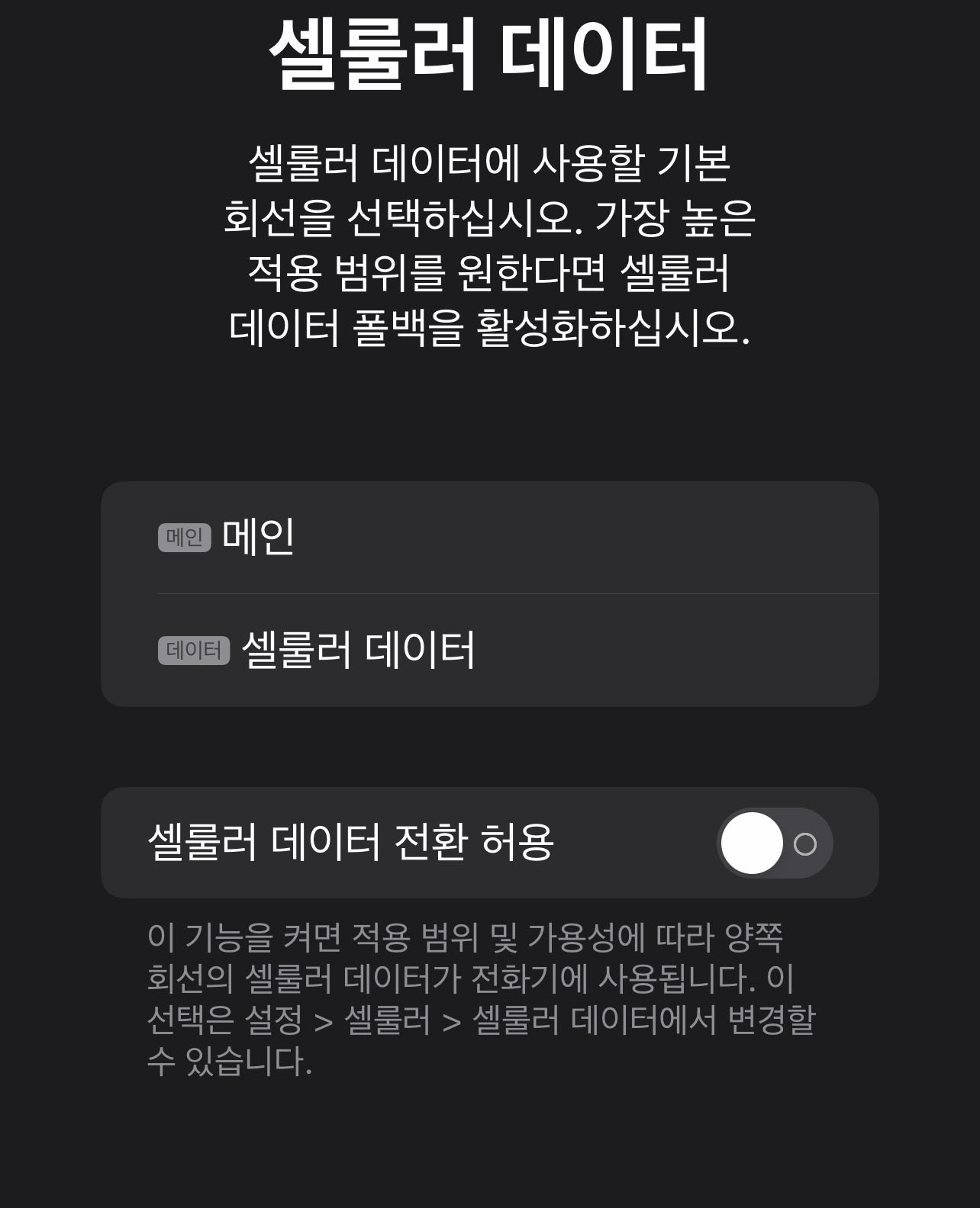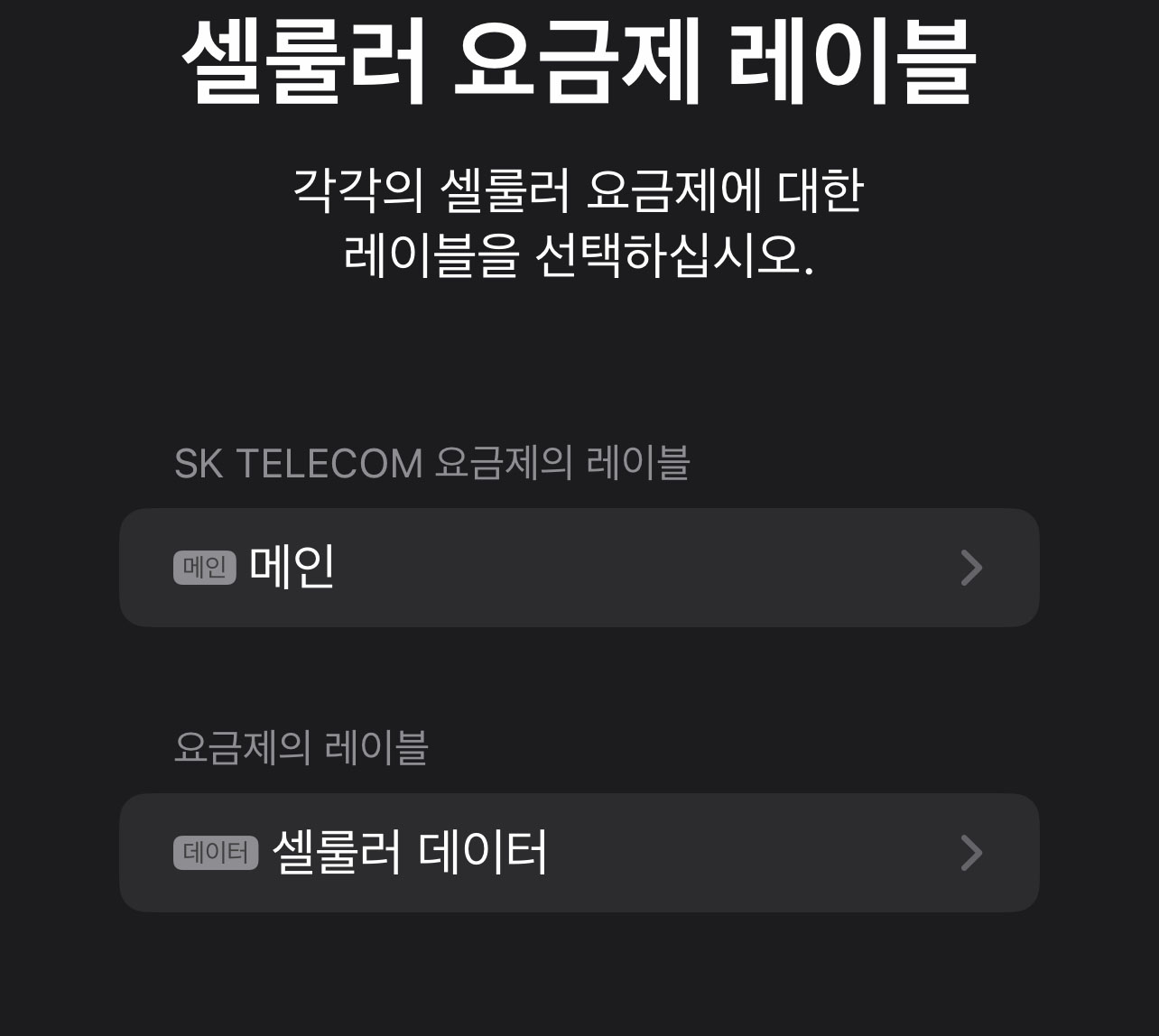 셀룰러 데이터 추가: '셀룰러' 또는 '모바일 데이터' 메뉴로 이동한 후 '셀룰러 요금제 추가'를 선택합니다.