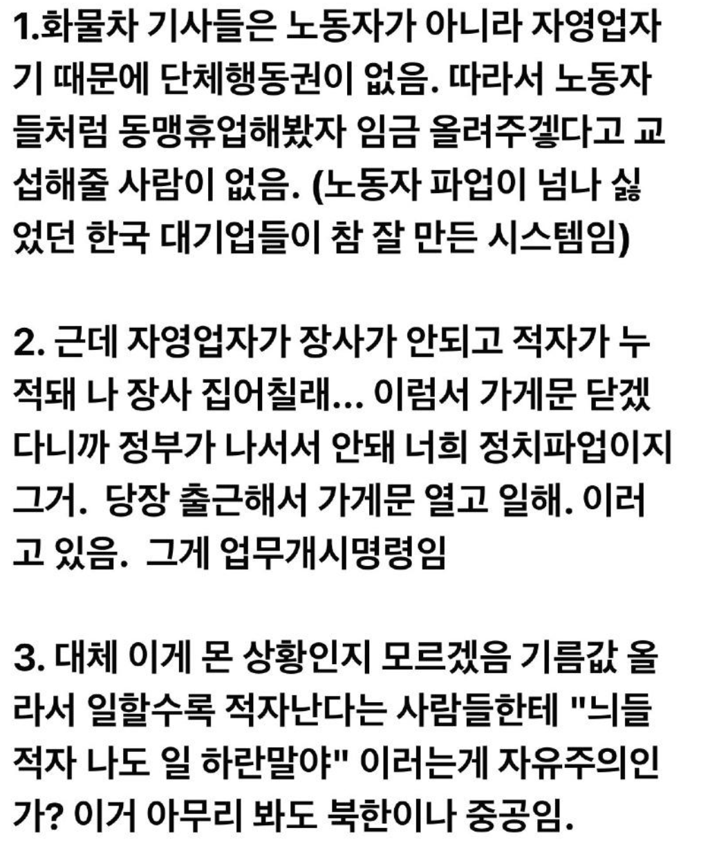 화물차 기사들은 노동자가 아니라 자영업자기 때문에 단체행동권이 없다