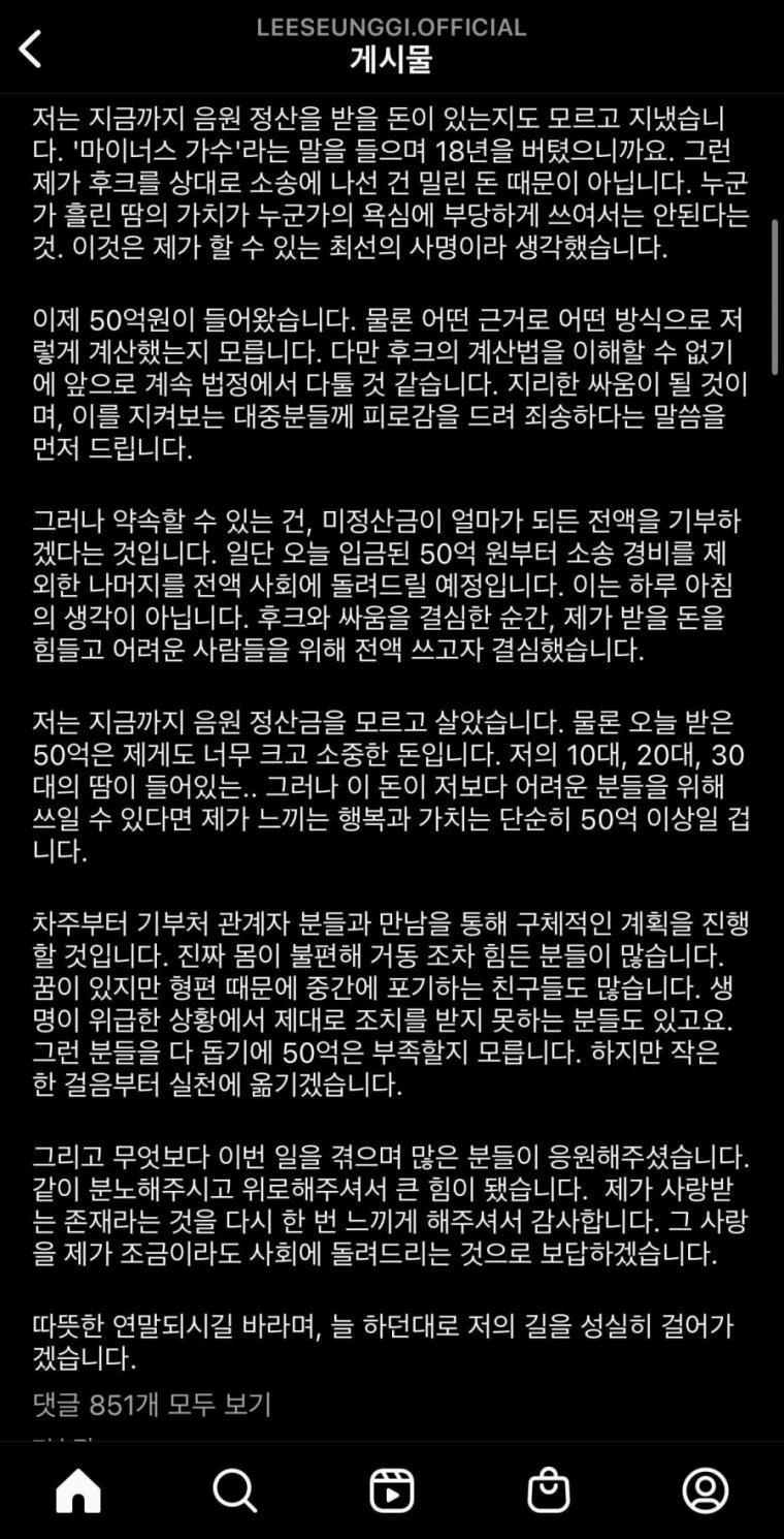 일단 오늘 정산된 50억부터 소송 경비를 제외한 나머지 전액을 사회에 기부를 할것이다.