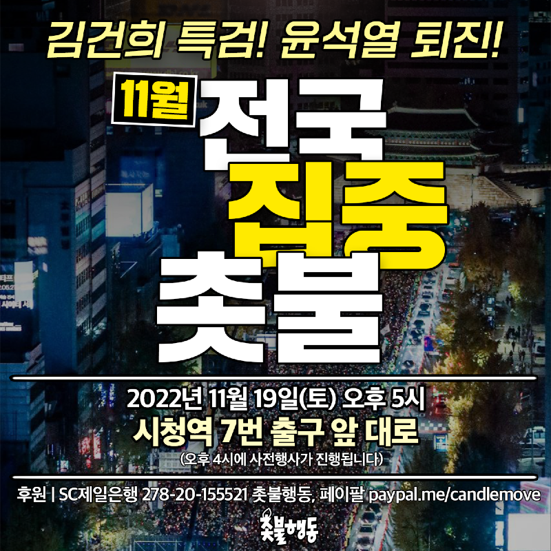 지난 10월 전국집중촛불 행진은 2만여명이 몰려 진행이 되었으며 촛불행동은 김건희특검-윤석열퇴진 촛불대행진을 매주 청계광장 앞, 시청일대에서 지속적으로 진행할 것이라고 합니다.