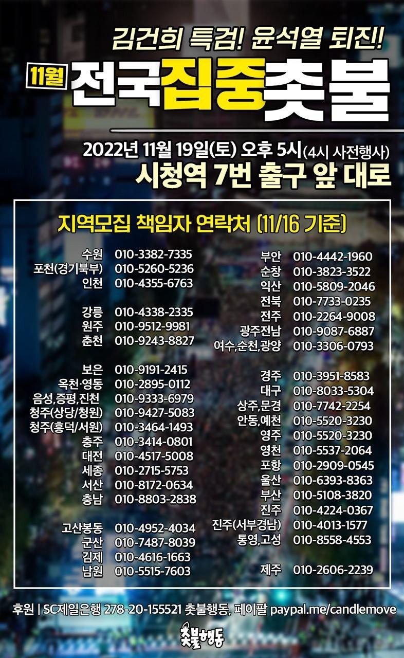 매주 토요일 '김건희 특검 윤석열 퇴진' 촛불집회를 주관하고 있는 '촛불승리전환행동의 전국 집중 촛불이 11월 19일 진행이 됩니다.