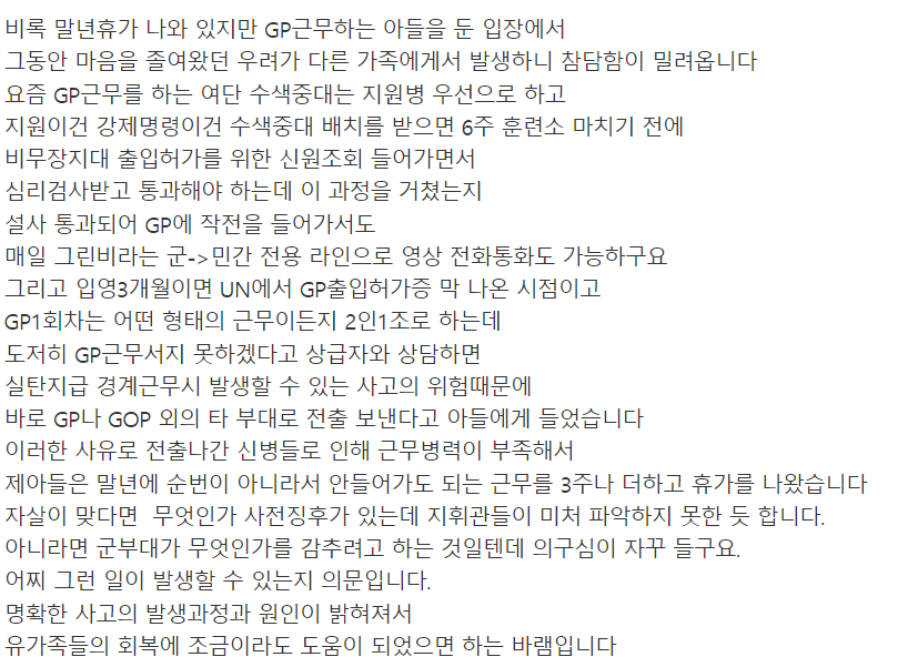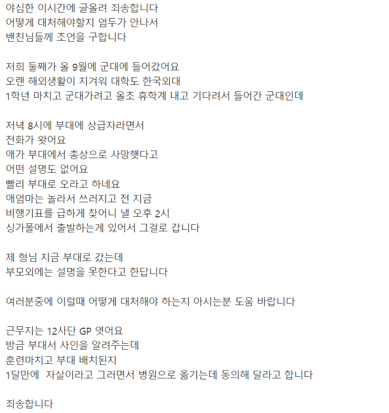 그리고 도착 후 부대에서는 부대배치 후 한달만에 자살이라고 병원으로 옮기는데 동의해달라고 했다고 합니다.