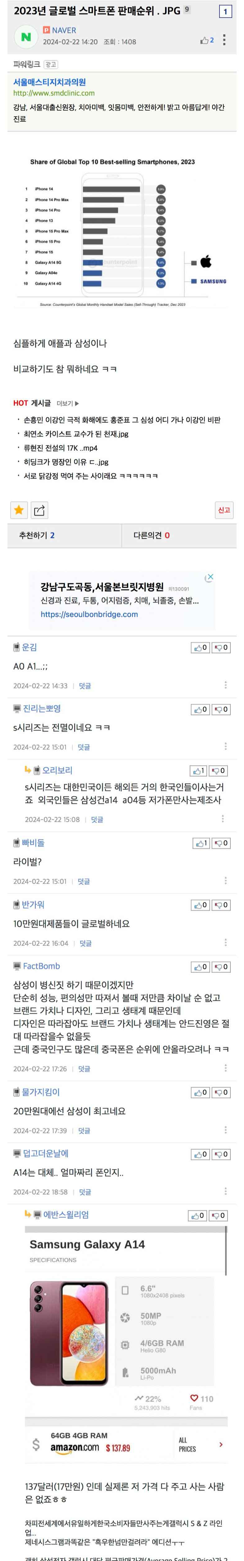 삼성은 Galaxy A14 5G, A04e, A14 4G 모델로 글로벌 판매 순위에 이름을 올렸습니다. 이는 삼성이 저가형 모델에 집중하여 다양한 소비자층을 공략하고 있음을 시사합니다. 특히, Galaxy A14 모델은 가성비가 뛰어나다는 평가를 받으며, 신흥 시장을 중심으로 좋은 반응을 얻고 있습니다.