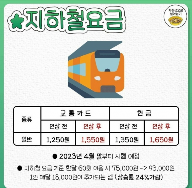 지하철요금도 1350에서 1650으로 인상