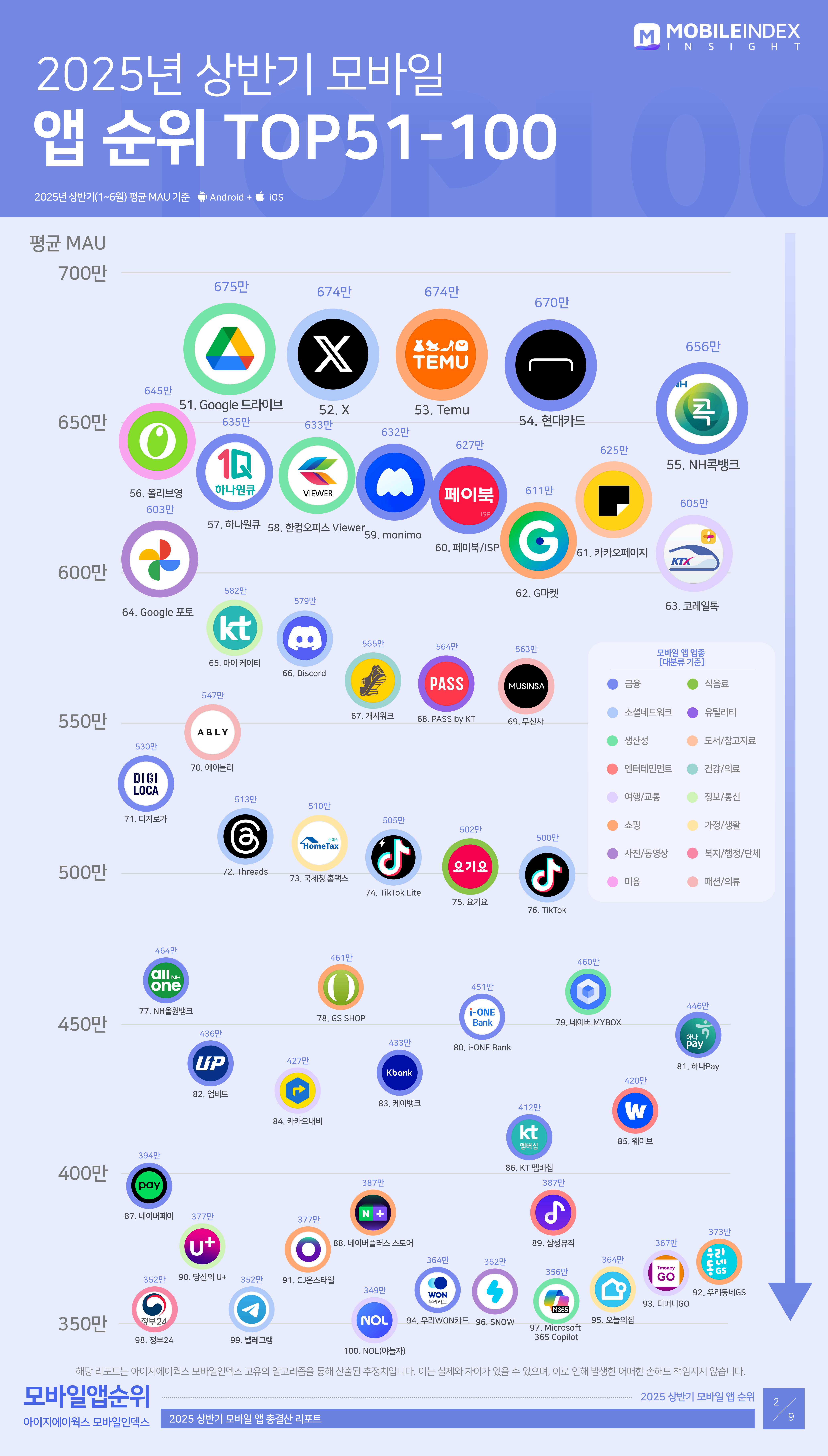📌 50위권에는 금융, 쇼핑, SNS, 식음료 등 실생활과 밀접한 앱들이 골고루 포진했어요.