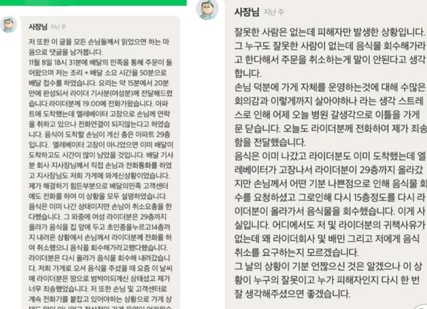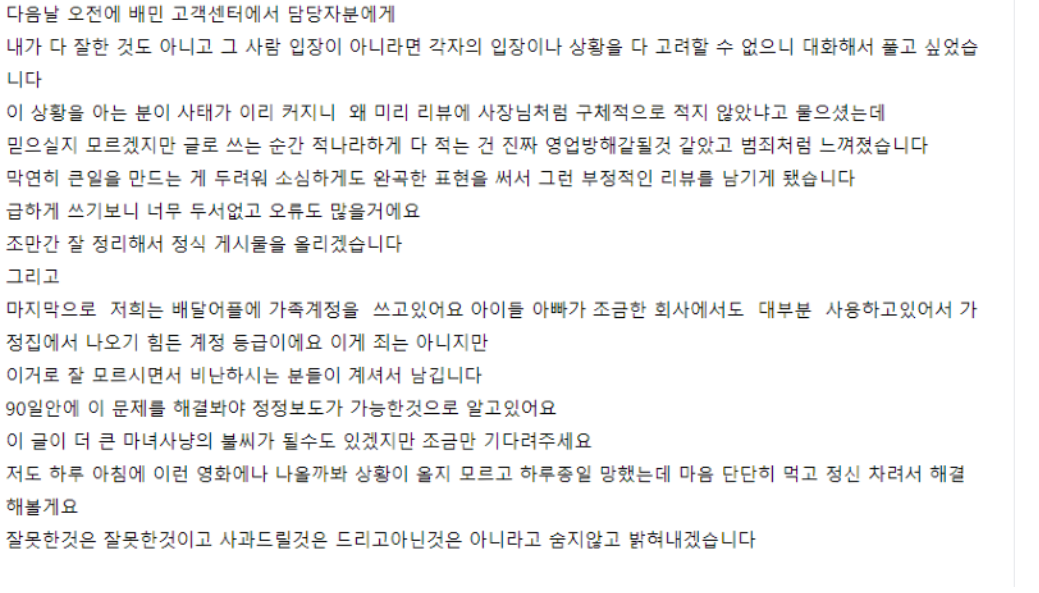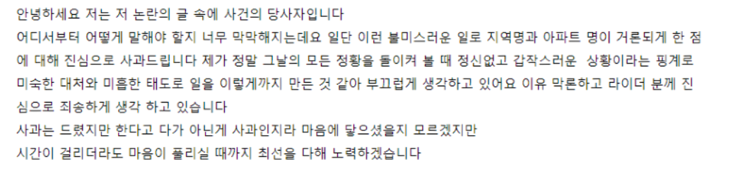 미숙한 대처와 미흡한 태도로 일을 이렇게까지 만든 것 같아 부끄럽게 생각하고 있어요 이유 막론하고 라이더 분께 진