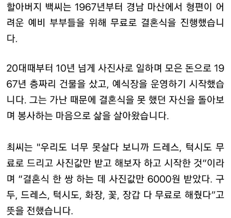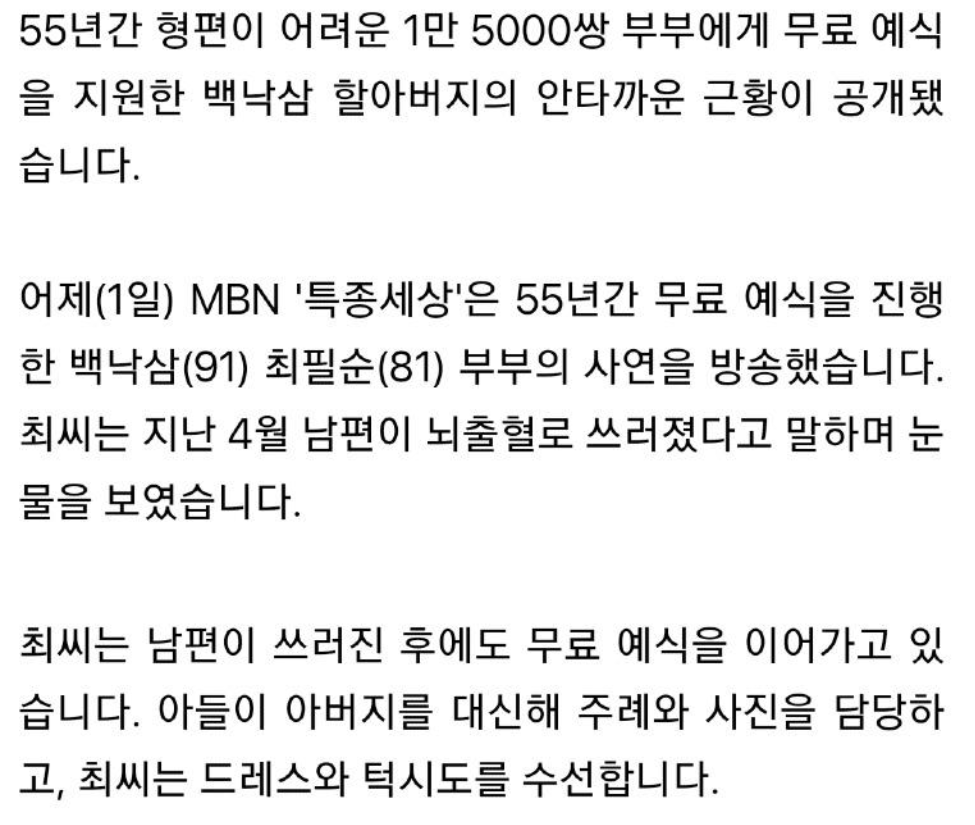 형편이 어려운 이를 위해 무료 예식장을 운영하셨던 분이신데...