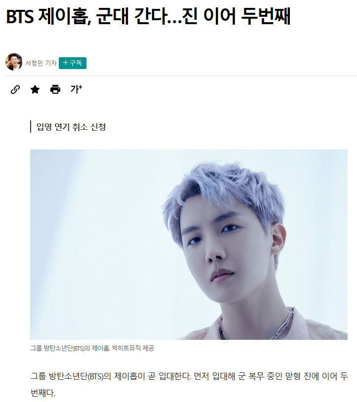 BTS 제이홉 군 입대 발표에 선임 “진”이 한말