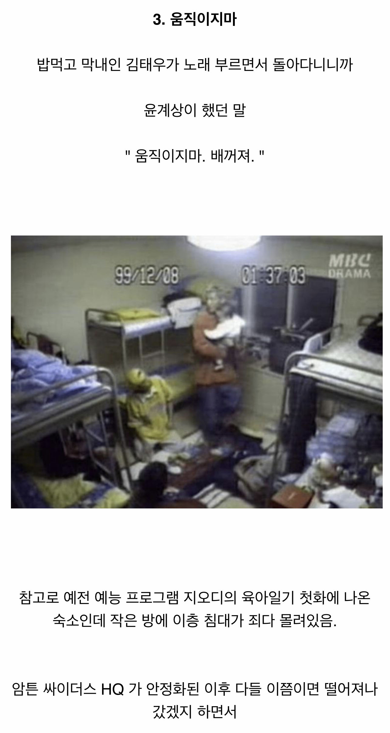 막내였던 김태우가 노래부르며 돌아다니깐 윤계상이 배고파진다고 움직이지마 라고 했던 사연등~