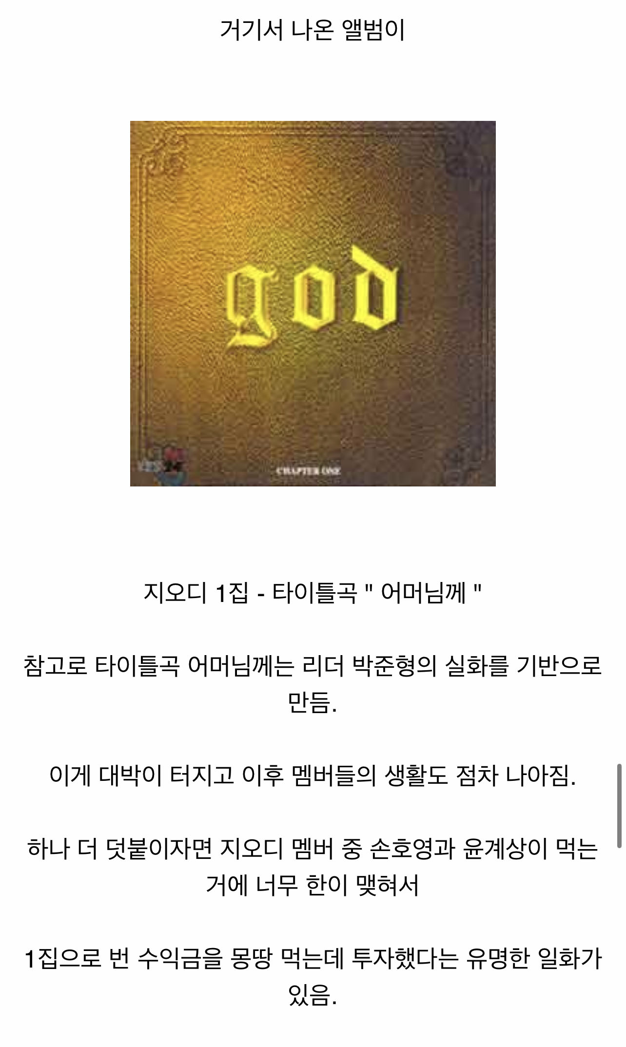 소속사 사장도 당연히 아이들이 도망을 갔다고 생각을 했지만 열심히 숙소에서 버티고 있는 모습에 감명받아서 어떻게든 GOD1집이 나오게 되었다고 합니다.
