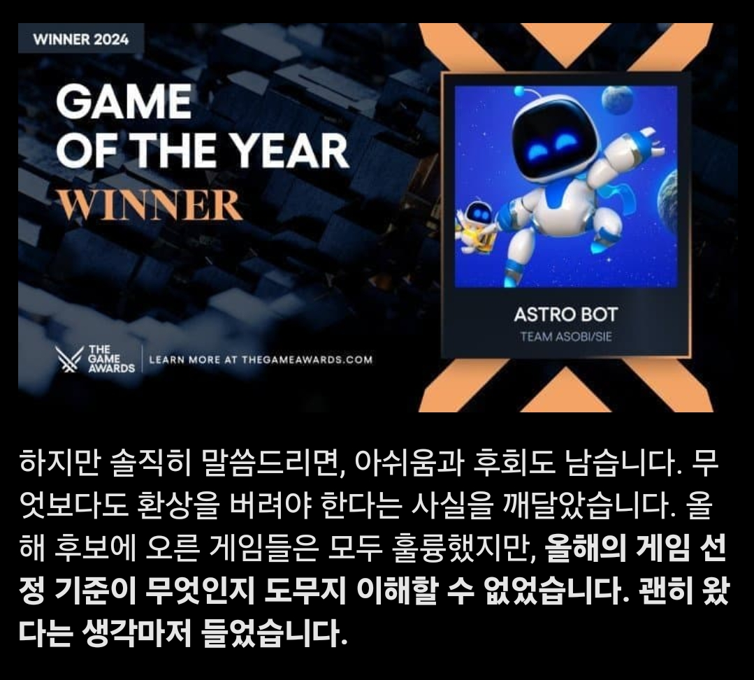 올해 Game of the Year(GOTY)에서 소니의 일본팀 팀 아소비가 개발한 *‘아스트로봇’*이 수상했습니다. 하지만 그 과정에서 중국 게이머들이 밀어주던 게임 *‘검은신화 오공’*이 탈락하게 되면서 예상치 못한 논란이 벌어졌습니다.