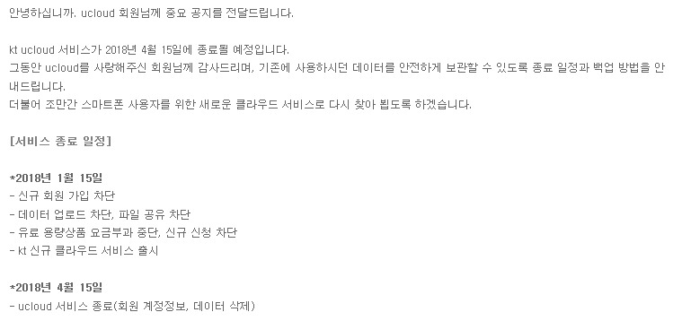 그런데, 최근에 KT 유클라우드가 서비스를 종료한다는 공지가 올라왔습니다. 6년 넘게 사용해왔던 유클라우드가 갑자기 종료된다는 소식을 듣고 놀랐습니다. 저의 158기가의 자료들이 사라질 위기에 처했습니다.
