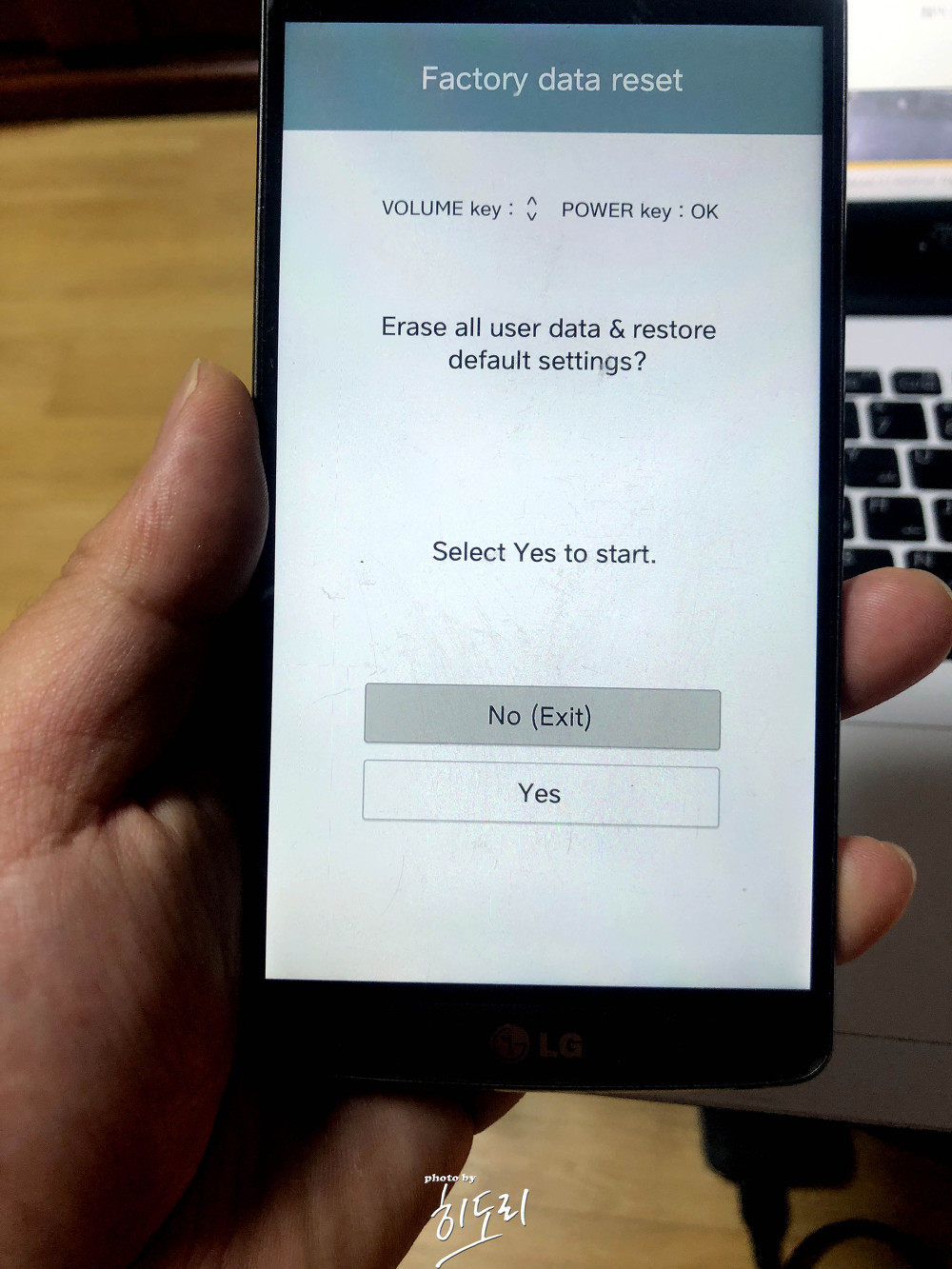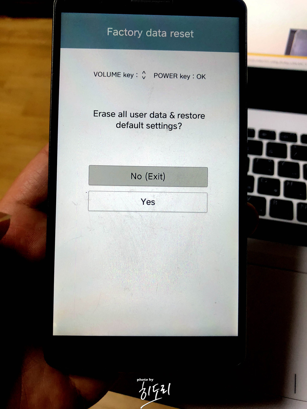 - Factory data reset 화면이 뜨면, 볼륨키로 이동 → Yes 선택 → 전원 버튼으로 확정