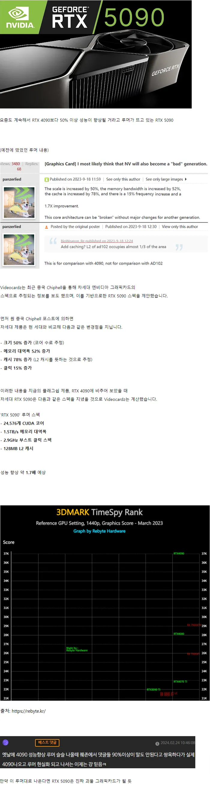 Rebyte Hardware의 3DMARK TimeSpy 랭킹에 따르면, RTX 4090은 이미 높은 점수를 기록하고 있습니다. RTX 5090이 이를 1.7배 상회하는 성능을 보인다면, 차세대 게이밍 환경에서의 리더십을 확고히 할 것입니다.