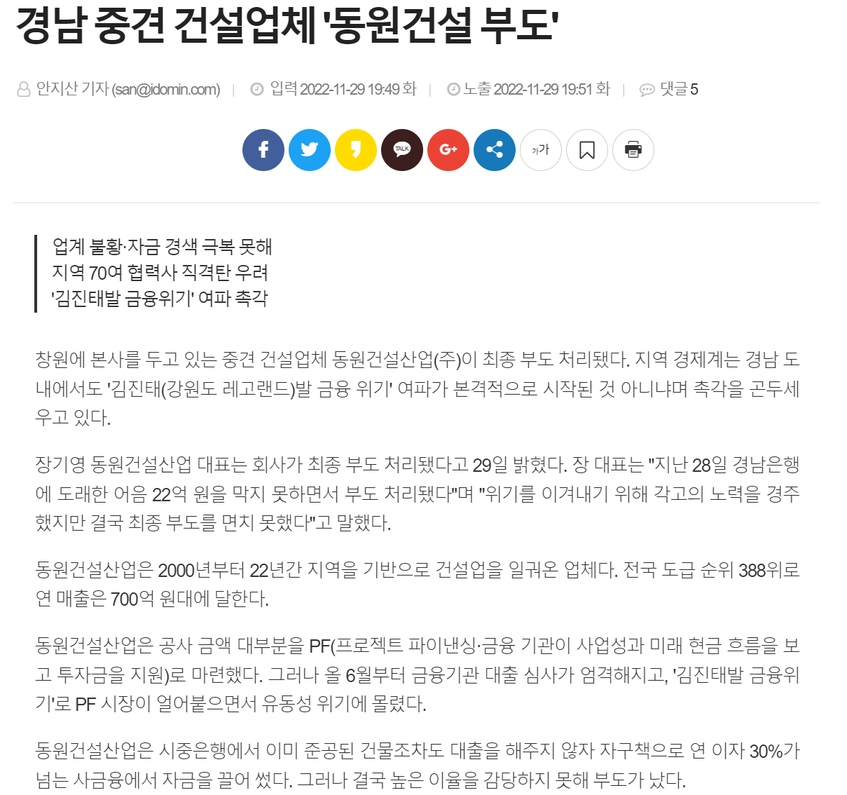 경남의 중소기업 건설업체 동원건설이 부도가 났습니다. 본격적으로 시작되는건가... 무섭기도 합니다. 동원건설이라고 해서 동원개발과 같은 그룹인가 생각했지만 다행히 전혀 틀린 회사라서 입주를 기다리시는 동원개발 입주민들은 안도의 한숨을 쉬기도 했습니다. 동원건설의 부도로 관련 된 글들이 많이 있는데 그 중 동원건설과 연결이 되어 있는 한 업체가 있다고 합니다. 위와 같은 제목으로 기사도 나오고 있는데 내용은 즉 자신의 명의로 세금 체납 되어 남의 명의로 사업을 한 뒤, 고의 부도를 내고 파산하였지만, 실질적으로 이 이후, 다양한 건물을 짓고 또 지으면서 자신은 뒤로 숨어 재벌처럼 살고 있는 건물주 현재 피해자들은 하루하루 힘겹게 살아가고 있지만 위 부동산 업자는 최근에도 100억대에 달하는 건물을 2개나 ..